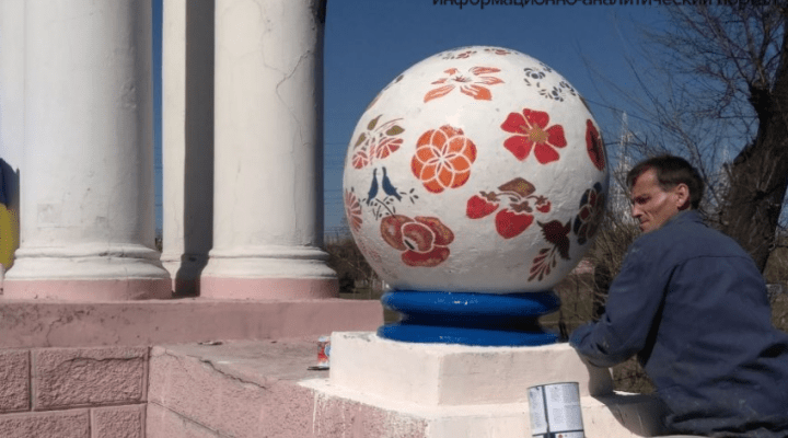 Аж ось він перейшов на інший рівень. Розмалював кулі на мосту по Соборному, між пр. Металургів і пл. Поляка псевдо-петриківкою. (Звісно, ніякий то не петриківський розпис, так, не дуже майстерна копія.) І от я читаю в Facebook, як естетично підковані жителі міста щиро обурюються цьому кітчу – мовляв, люди добрі, що ж це все робиться, за що нам таке горе? Читаю і думаю.