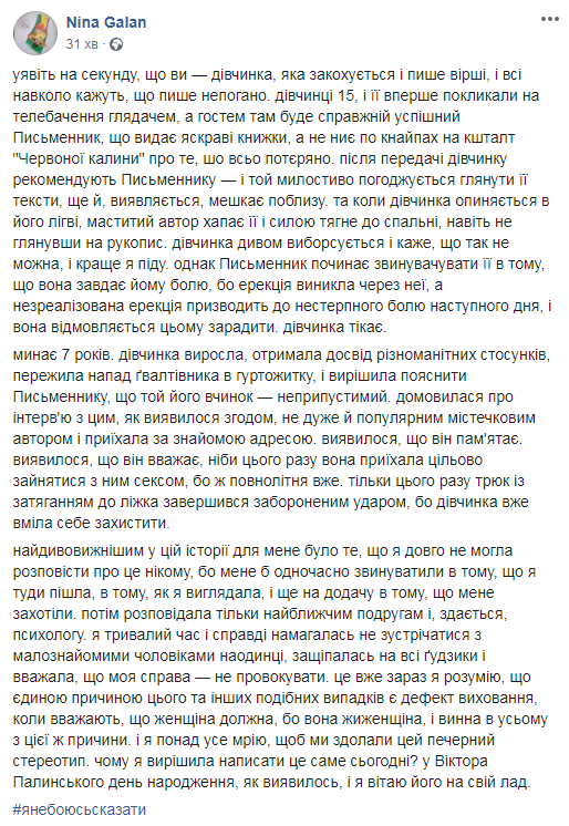 Але історія справді скандальна. Ба більше – мова йде про ситуацію із 15-річною дівчинкою, тобто неповнолітньою. І по-харошому, в Нацспіпись мали б відреагувати. Звинувачення ж дуже серйозне. На звинувачення на адресу Гарві Вайнштейна відреагували – аж до кримінального переслідування.