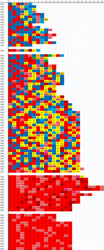 З 1947 по 1992 роки – звична нам клубна картина, з розбивкою на республіки і автономії. С(в) та С(к) – думаю, зрозуміло, що йдеться про Войводіну та Косово. А от Т – це Вільна територія Трієст, команда з якої трохи грала у югославській першості.