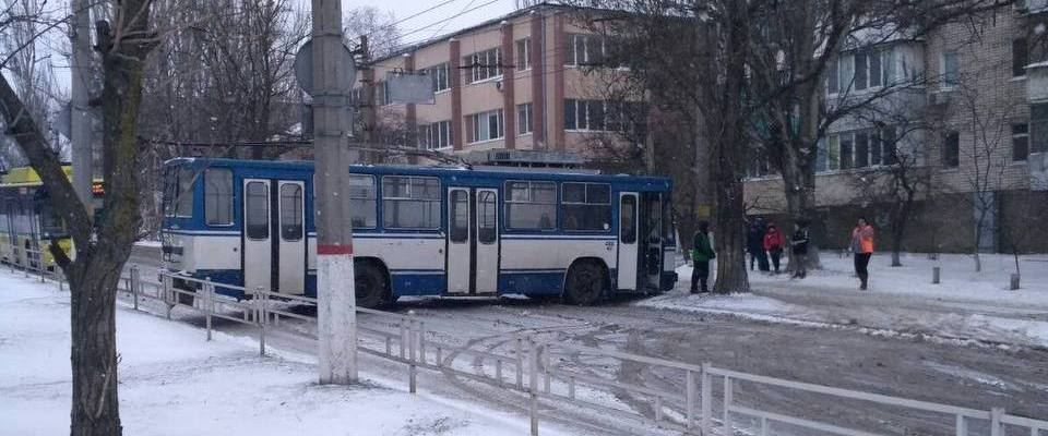 Фото ДТП ви бачите нагорі. Тролейбус на слизькій дорозі розвернуло. Як саме розвернуло – ви бачите на фото.