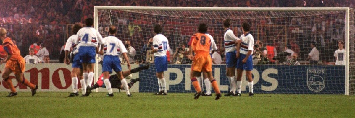 Единственный гол был забит в конце дополнительного времени после розыгрыша свободного, которого, по мнению тренера “Сампы” Вуядина Бошкова, не было. (Пожалуй, он прав – Маннини отобрал мяч в подкате у Эусебио и на какое-то время задержал его (мяч, есессссно!) в ногах в статическом состоянии. Ну и что?!) Мяч был установлен метрах в 30 от ворот чуть правее от центра. Стоичков откатил Бакеро, тот остановил, а Куман от души разрядил свою пушку в дальний, правый от вратаря угол. Пальюка не у дел, вся “Сампа” в шоке…