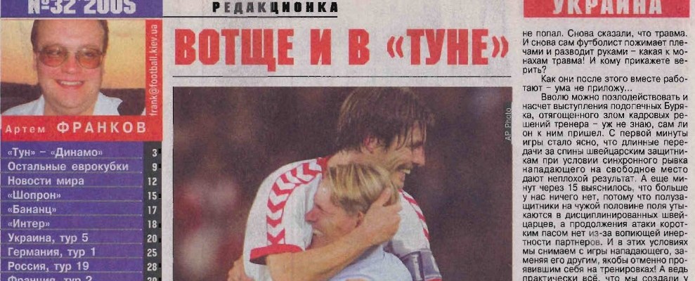 Примечательно уже само начало статьи: «К сожалению, пока еще не состоялось общения с руководством «Динамо». Жаль – встреча и откровенный разговор напрашиваются…» (№ 32, стр.3, кол.1). Ладно, с руководством не получилось, а с игроками? Напомню, с момента катастрофы в Берне, с, возможно, переломного для судьбы и истории «Динамо» матча до написания статьи прошло трое или четверо суток. Коллеги Франкова из других газет успели встретиться с Шацких, Чернатом, Ребровым, еще, по-моему, с рядом футболистов, взять у них небольшие, но достаточно информативные интервью. Но не беда, ведь наш герой не склонен искать простых путей. Он самодостаточен. И он сам в состоянии дать ответ на любой вопрос. Ну что же, грех не послушать ведущего футбольного журналиста Украины и просто умного человека.