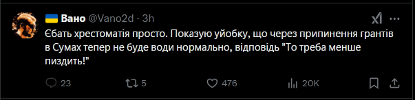 А ще мені здається, що у цій історії є два уже неважливі для нинішньої України моменти. Перший – це те, що принаймні якась частина грантів справді розписується по кишенях своїх без якоїсь суспільної користі. Але про це чомусь ті, хто забороняють реготати з “бідних, нещасних грантожерів” – забувають. Другий момент – це право на свободу слова. Люди, які задоволені мимовільним ударом Трампа по “грантожерах”, мають точно таке ж право на свою позицію, свої емоції, як і ті, хто незадоволені цією ситуацією. Але, оскільки Україна уже фактично перетворилася на дику суміш Московії, Індії та Третього Райху, такому ставленню однієї частини суспільства до іншої я не дивуюся і не вважаю (нехай це і виглядає як поза для привернення уваги до цієї катастрофи, яку поки що ніхто не бачить, а дехто відверто кришує, видаючи індульгенції тим чи іншим персонажам) цей момент важливим. Ви згодом самі зрозумієте, що ці моменти теж важливі, навіть не так – значно важливіші за інші, але то буде згодом. А поки що більшість цього не розуміє, то і говорити нічого.