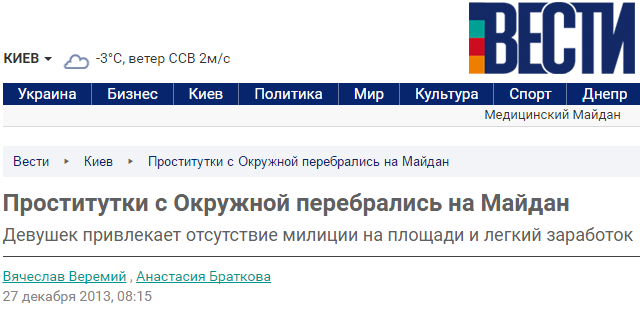 Вчера вечером нам удалось поговорить с двумя девушками легкого поведения. «Мы сюда перебрались с другого района, нас сейчас там менты ловят, а тут спокойно — они боятся на Майдан ходить. Съемных квартир вокруг Крещатика полно: все сейчас под бордели снимают, туристы-то сюда уже не едут, шумно, дымом пахнет. Цены разные — где-то от 150 грн. Но демпинговать тоже нельзя, тут ведь работают и девочки, которые всегда на Кресте, у них свои клиенты, и они очень злятся, что цены им сбивают. Митингующие тоже подходят, но бесплатно ничего не получают — все за деньги. Самый дешевый секс в машине, неподалеку. Подороже в квартире, в хороших условиях», — смеются путаны.