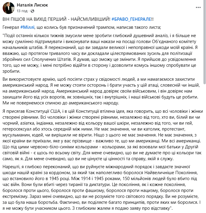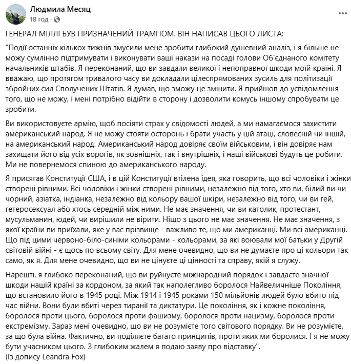 Марк Міллі залишив посаду ще у вересні 2023 року. Але, звісно ж, стадо навіть не намагалося перевірити цю інформацію. Воно готове зжерти усе на світі, аби тільки це їдло виглядало смачним. Зараз в тренді воювати по соцмережах з Трампом – стаду накидають, що Міллі влаштував демарш, написав листа і звільнився.